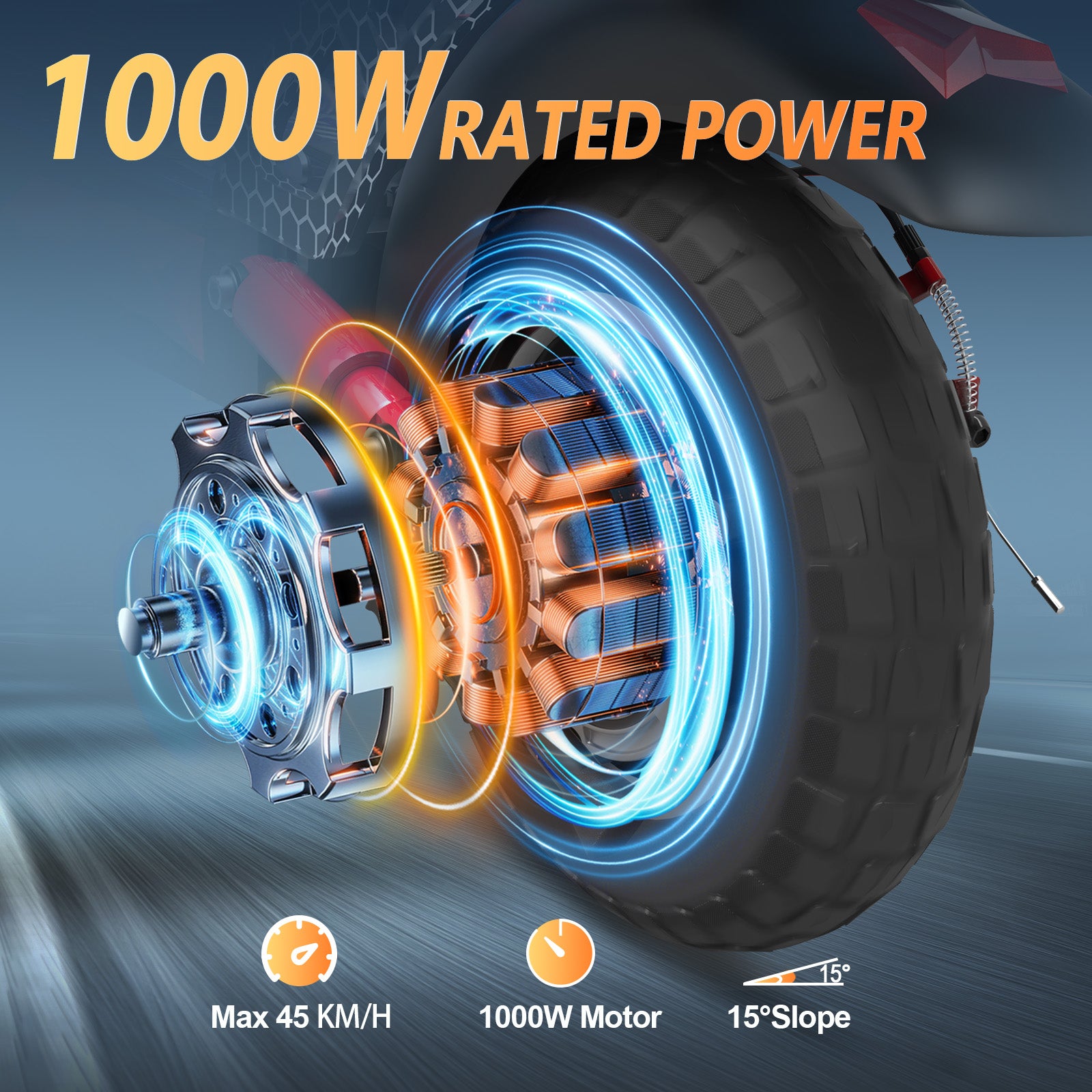 Equipped with a high-performance 1000W motor, this electric scooter delivers powerful acceleration and can reach speeds of up to 45 km/h. Whether you're cruising through city streets or tackling rough terrain, the strong motor provides smooth, stable, and responsive performance.