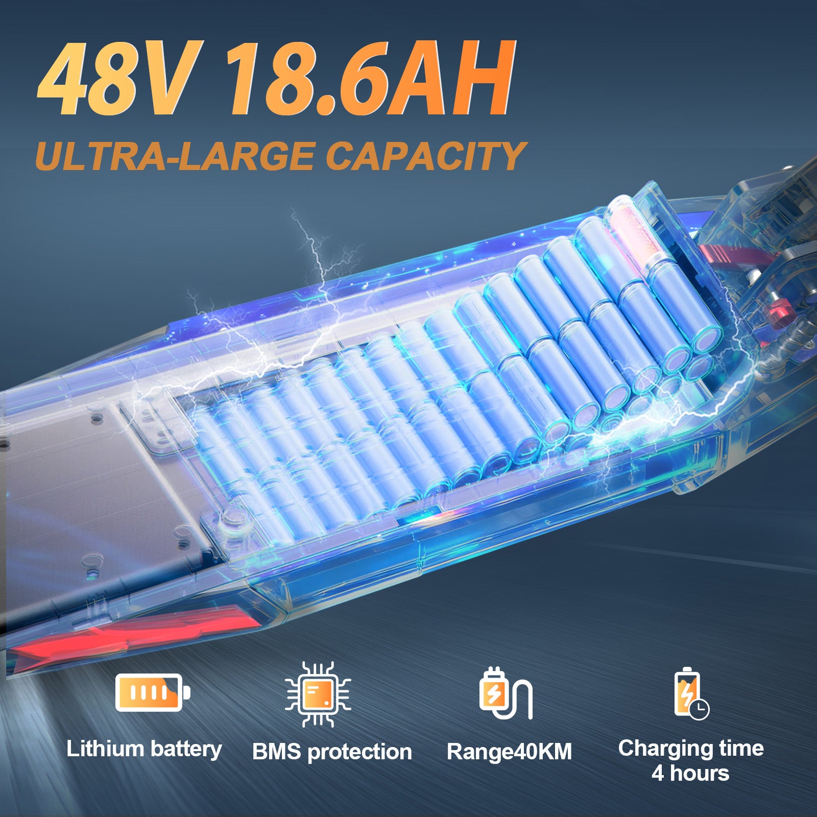 Equipped with a large 18.6Ah high-capacity battery, this electric scooter offers a riding range of up to 40 km on a single charge. The powerful battery ensures stable and consistent performance, even during longer rides.